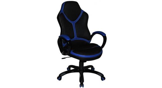 Silla gerencial para oficina en base en plástico hecha en tela y cuero sintético azul de colores negro y azul con apoya brazos nivel de altura mecanismo graduación en el asiento Espaldar ergonómico, ajustable en ángulo en una posición de bloqueo.