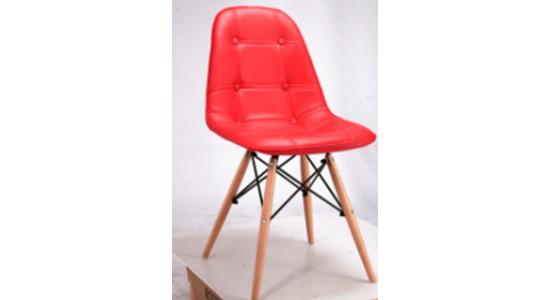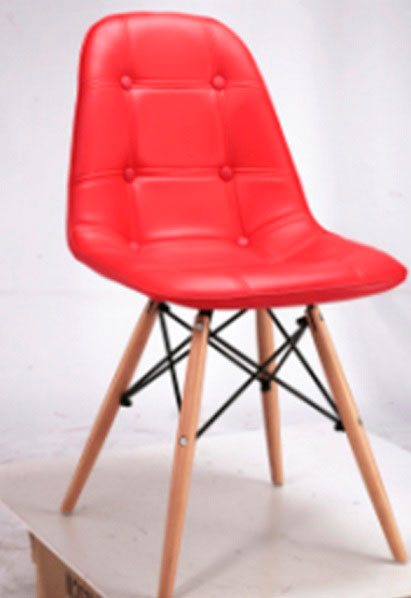 Silla hecha en cuero sintético color rojo con botones sus patas en madera con barras metálicas atornilladas