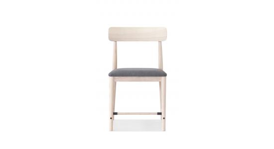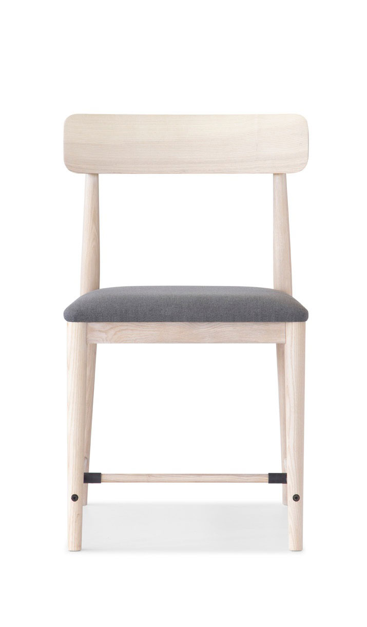 Silla en madera de diseño con tornillos su asiento en tela gris