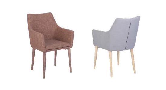 Silla en tela café y gris con apoya brazos sus patas en madera delgadas