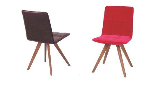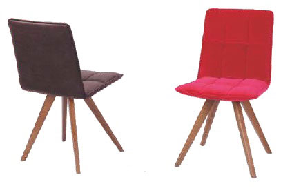 Silla en tela roja y café a cuadros y botones con patas delgadas en madera