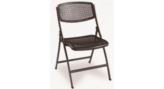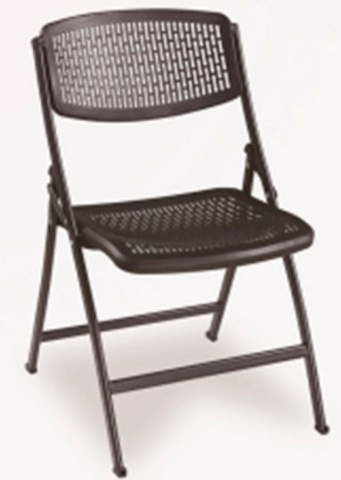 Silla metálica retráctil color negro con huecos en el espaldar y el asiento