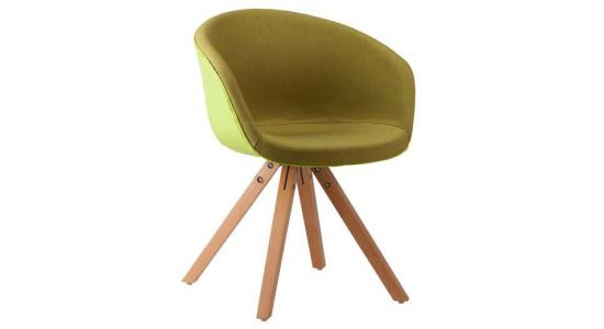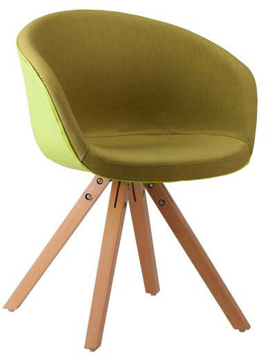 Silla moderna acolchada en tela verde con patas que se desprenden del asiento hacia afuera