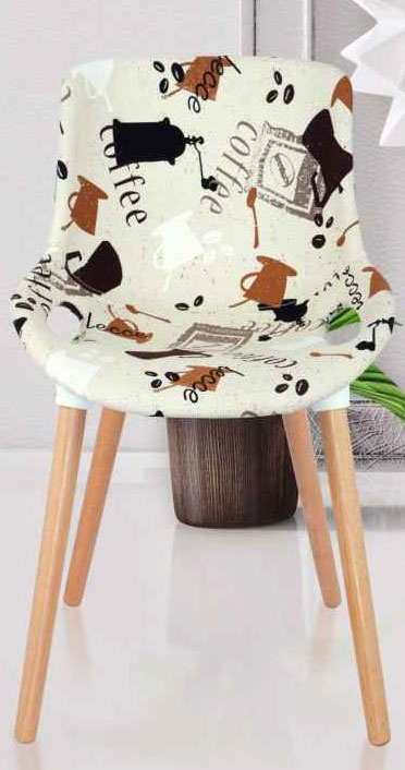 Silla moderna en tela grabada con imágenes de café sus patas en madera