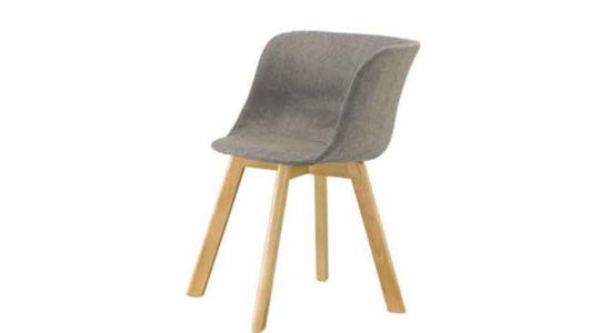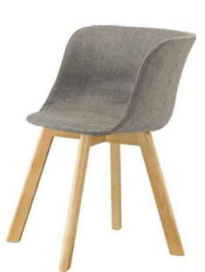 Silla moderna en tela color gris sus patas en madera salen de su estructura dándole un diseño único
