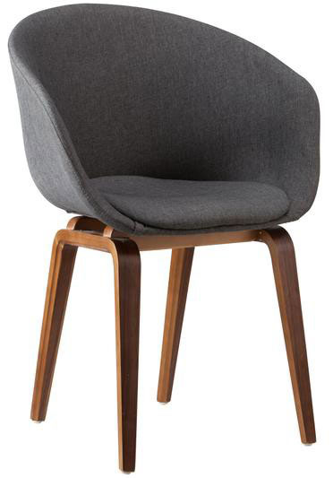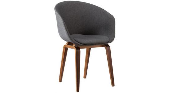 Silla moderna en tela gris con cojín estructura en forma de ovalo sus patas en madera oscura