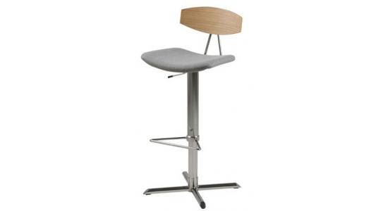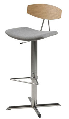 Inicio > Mobiliario > Silla Para Bar En Base Metalica Apoya Pies Asiento En Tela Gris Su Espaldar En Madera