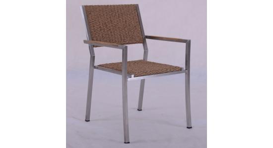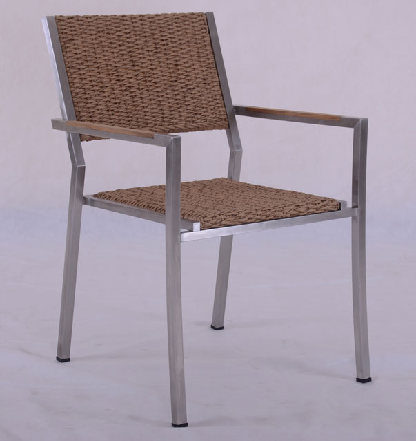 Silla para exteriores hecha en fibra sintética y metal solido con apoya brazos en madera