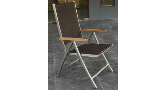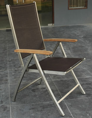 Silla para exteriores hecha en metal con barandales en madera y malla en tela