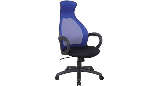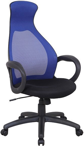 Silla gerencial para oficina en base en plástico y metal pintado de negro hecha en tela de colores negro y azul con apoya brazos en pp. nivel de altura mecanismo graduación en el asiento
