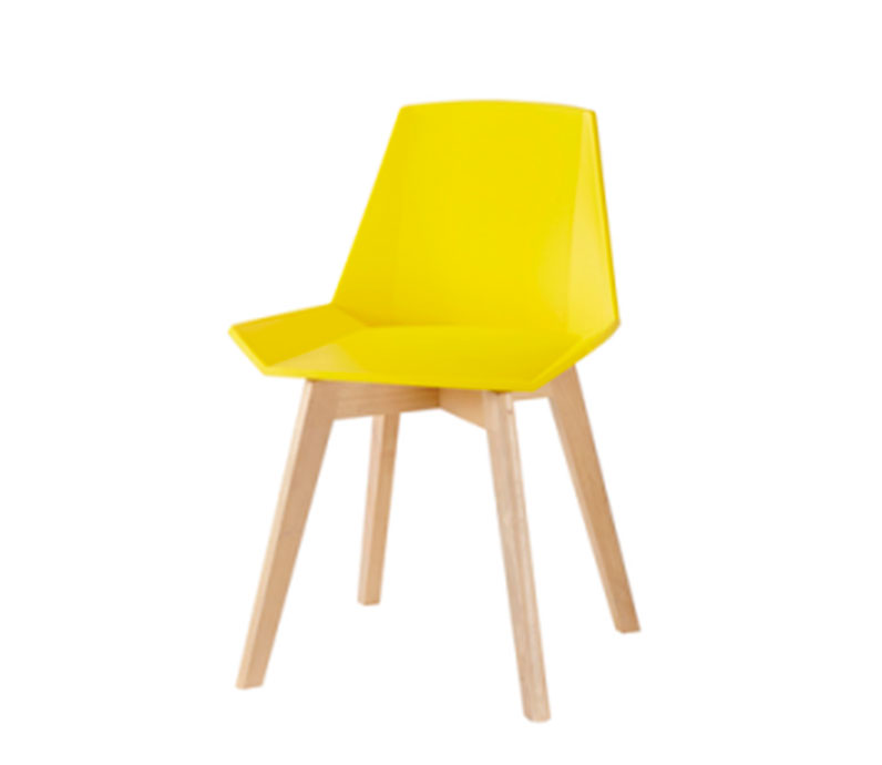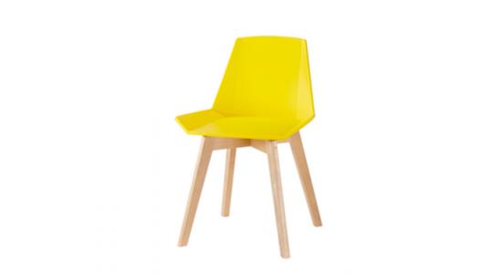 Silla plástica amarilla en diseño su base y patas en hechas en madera estructura cómoda y solida