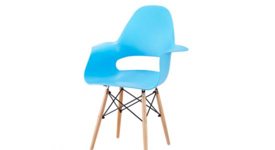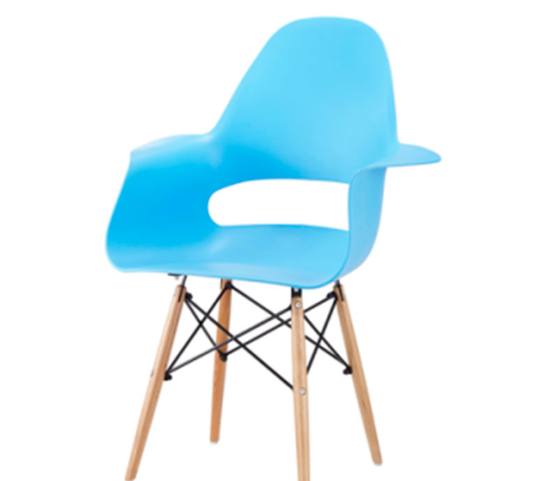 Silla plástica azul en diseño con coderas sus patas en madera con refuerzos metálicos pintados de negro