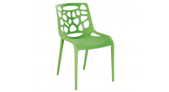 Silla hecha en plástico de color verde claro con diseño en el espaldar