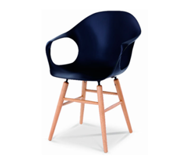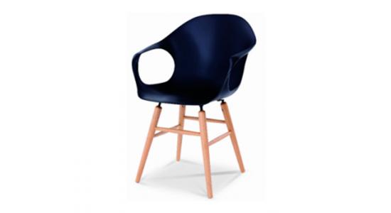 Silla plástica negra en diseño con coderas sus patas en madera