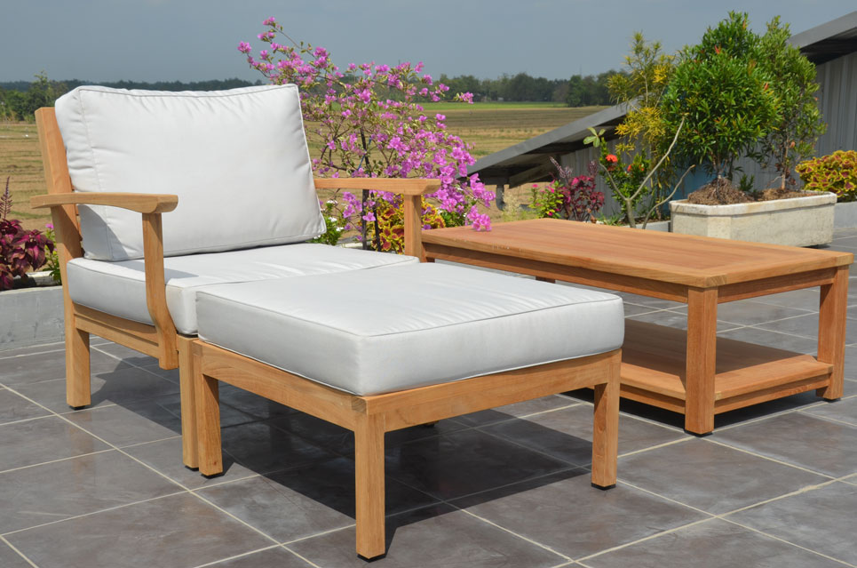 Sillón descansador con mesa para uso en espacios al aire libre hecho en madera para acomodar tres confortables cojines