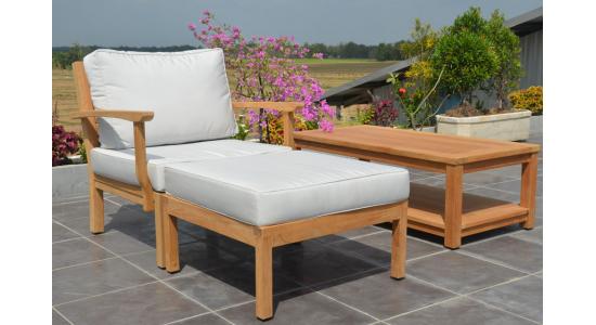 Sillón descansador para exteriores hecho en madera con cojines blancos