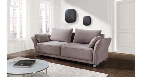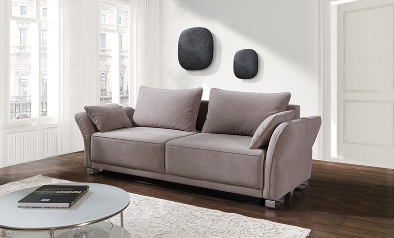Sofá de tela fina suave, color beige patas en madera con dos cojines dándole un estilo único para combinar espacios y colores