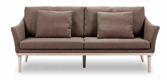 Sofá en tela café claro con base y patas en madera un diseño estilo retro con dos cojines auxiliares