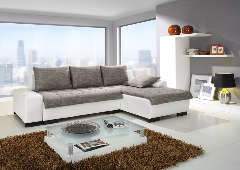 Sofá en l combinación de colores y materiales, blanco y Café patas en madera solida tela y cuero le dan un gran dinamismo al espacio en su combinación con colores y otros muebles.