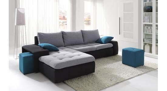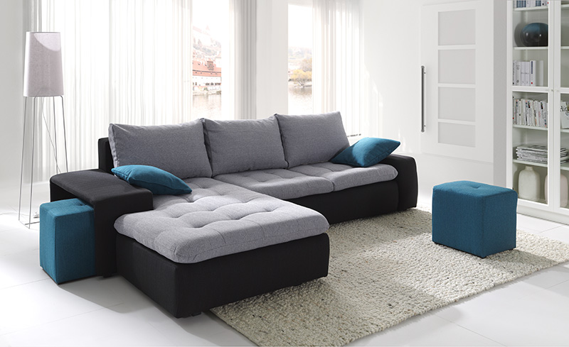 Sofá en l tela con 3 estilos de color blanco negro y azul para sus cojines, le dan un estilo único juvenil para espacios con gran personalidad.