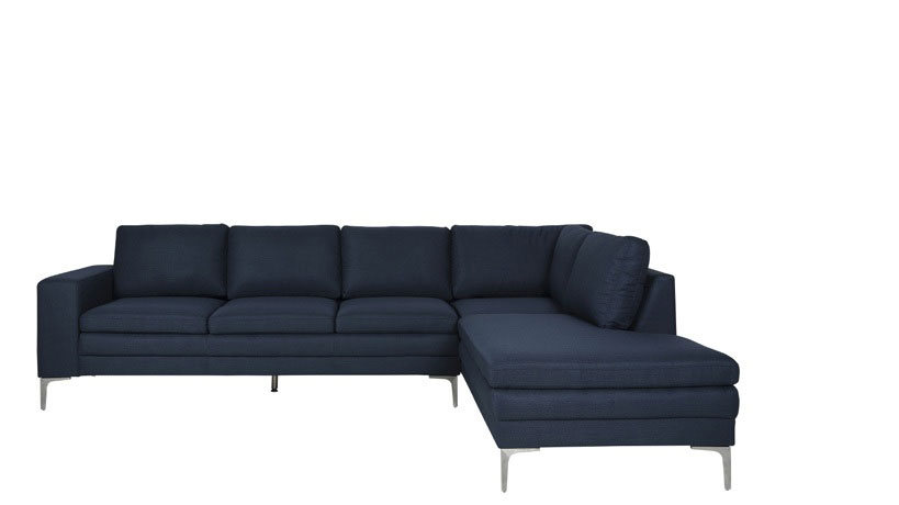 Sofá en l extra largo azul cuatro puestos uno de ellos para recostarse con comodidad, patas en metal ofrece un llamativo estilo que marca la tendencia de espacios grandes