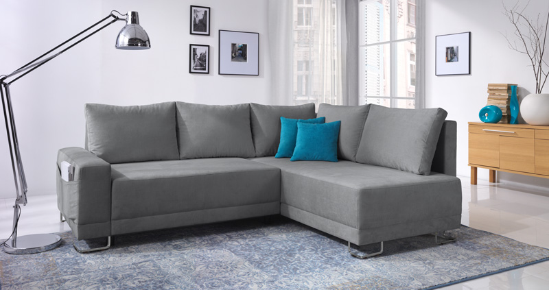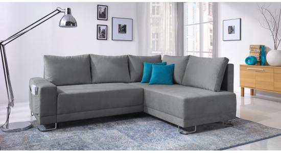 Sofá en l tela gris claro con patas metálicas en un diseño moderno, le dan un estilo único.