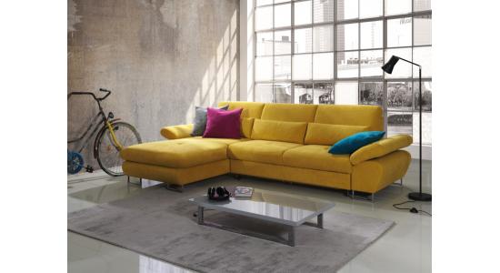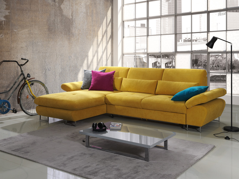Sofá en l color mostaza cómodo y dinámico en tela con patas en metal ángulos cómodos tomándose el protagonismo del lugar.