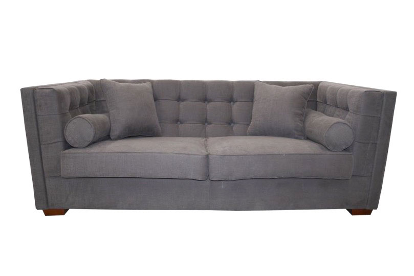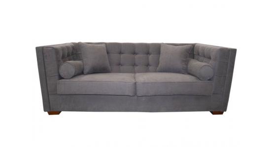 Sofá fabricado en tela suave color Gris con botones, sus patas de madera dura, color oak, le dan un estilo moderno, ideal para uso en espacios , combinándolo con paredes de diferentes colores.