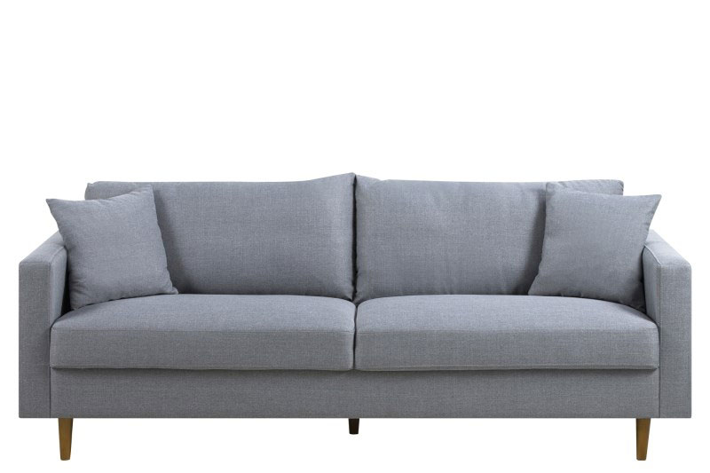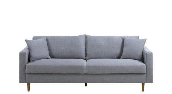 Sofá fabricado en tela corsica color gris claro, sus patas de madera, le dan un estilo fresco, ideal para uso en espacios , combinándolo con paredes de diferentes colores.