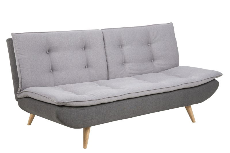 Sofá fabricado en tela lino color gris claro y oscuro, sus patas de madera, con botones incrustados que le dan un estilo casual, ideal para uso en espacios , combinándolo con paredes de diferentes colores.