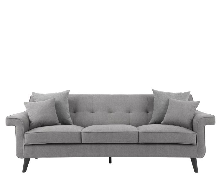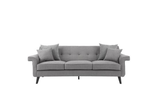 Sofá fabricado en tela lino color gris oscuro, sus patas de madera, con botones incrustados que le dan un estilo casual, ideal para uso en espacios , combinándolo con paredes de diferentes colores.