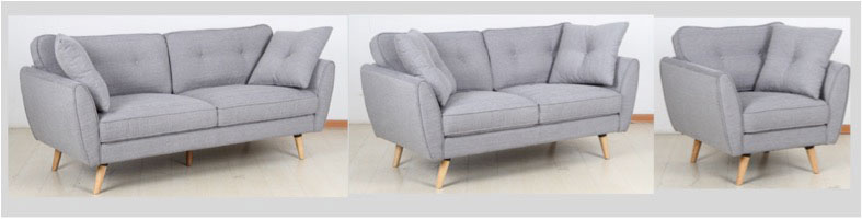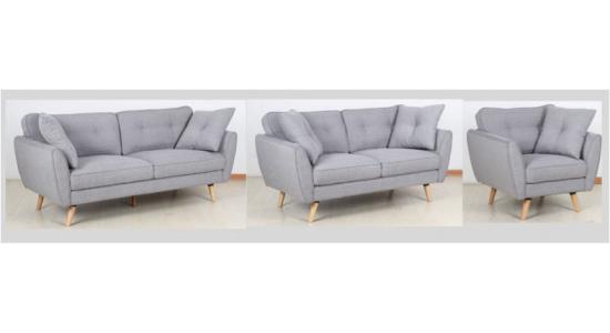 Sofá fabricado en tela lino color gris claro, sus patas de madera, le dan un estilo casual, ideal para uso en espacios , combinándolo con paredes de diferentes colores.