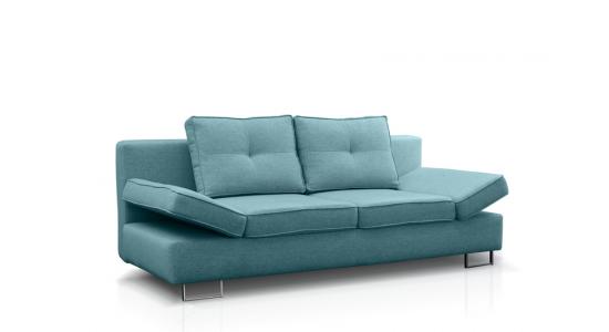 Sofá fabricado en lino, color verde claro con patas en metal un diseño moderno con dos cojines grandes dándole un aire fresco e ideal para espacios y color