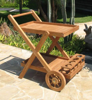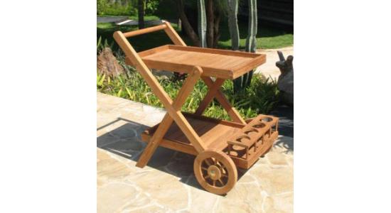 Trolley para bar en madera uso exterior con dos bandejas y espacio para cuatro botellas